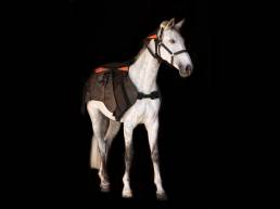 Bestehend aus handgearbeiteter Pferdedecke mit Kopfteil, Ladegerät und Aufbewahrung. Passend für Klein- und Großpferde. 8 Lichtmodule.
